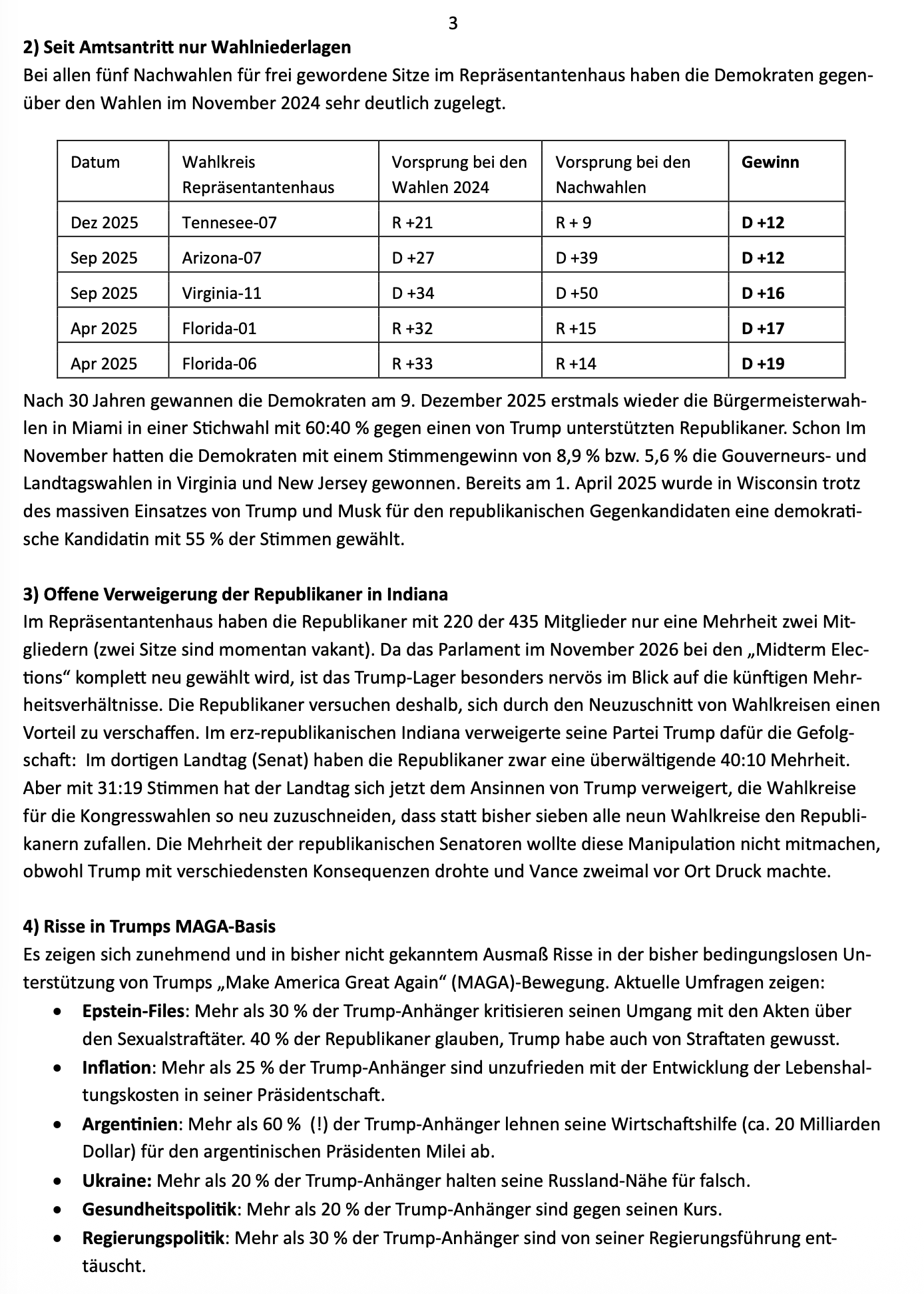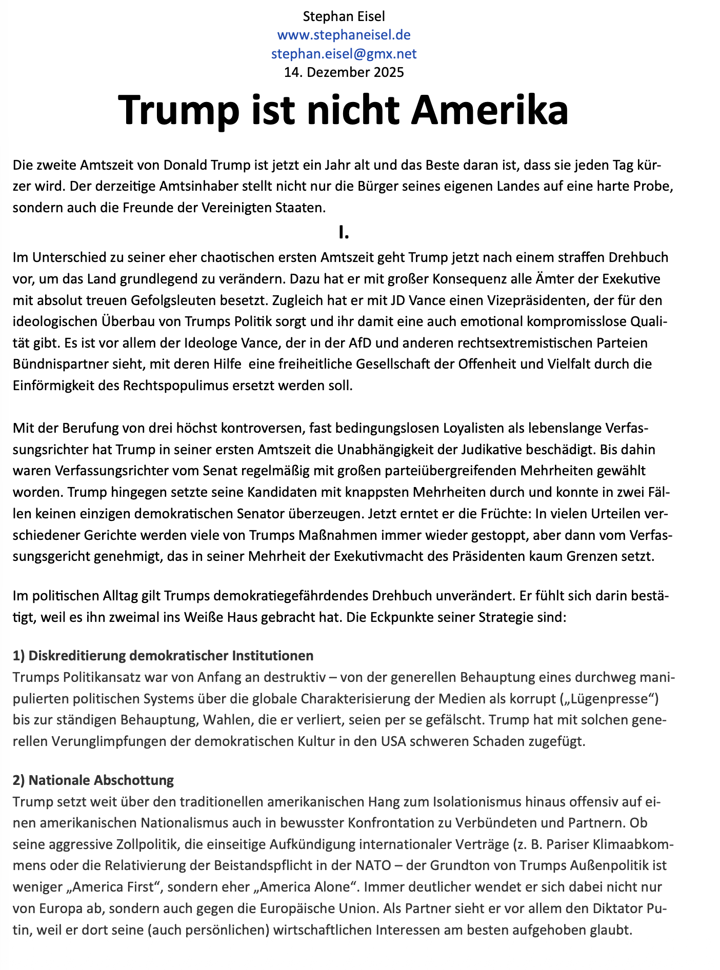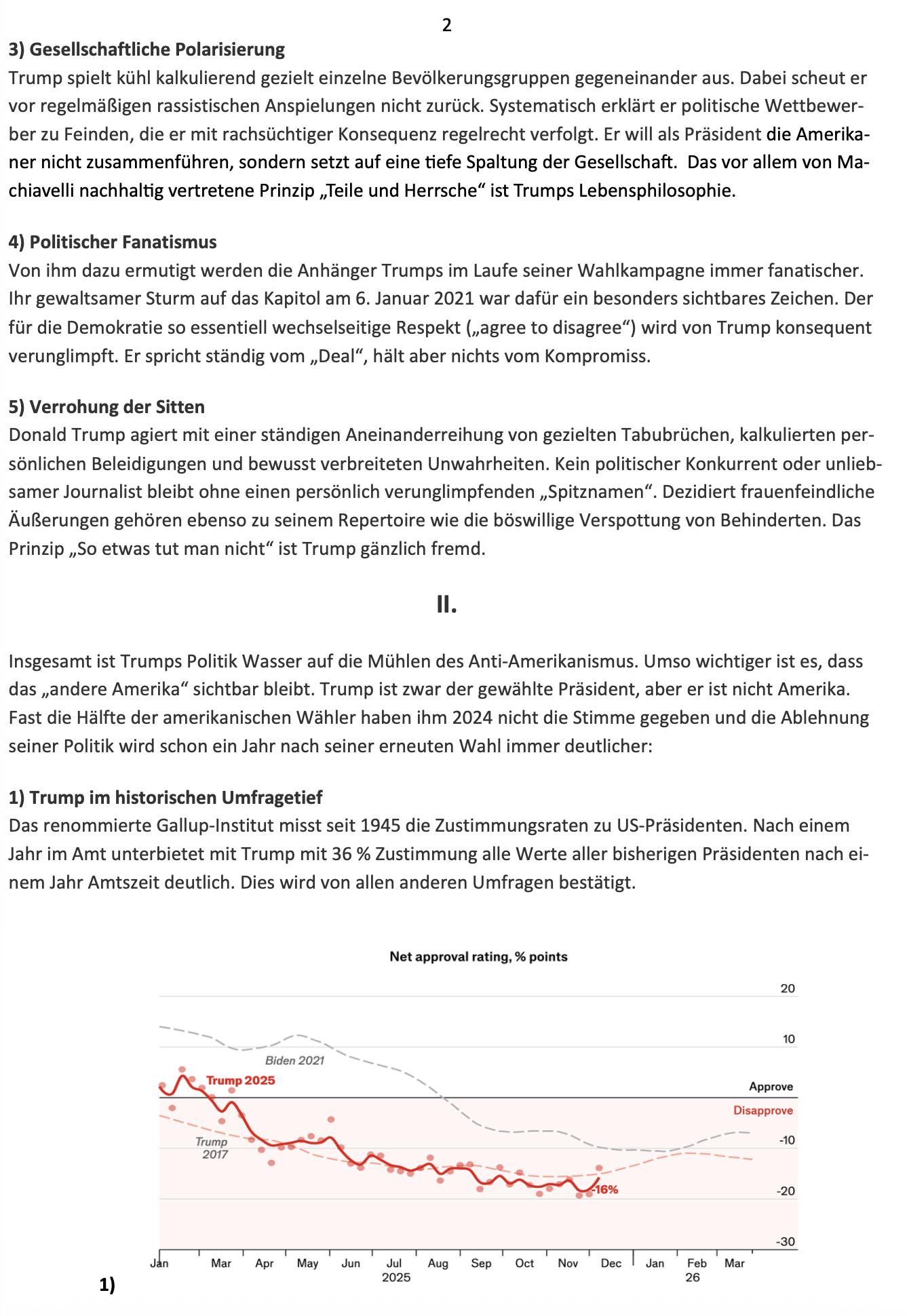 bei den Irritationen über die Politik des US- Präsidenten nicht vergessen. Stephan Eisel zeiht eine Bilanz des ersten Jahres seiner zweiten Amtszeit und analysiert auch erste Zweifel in der bis so bedingungslosen Gefolgschaft Trumps.