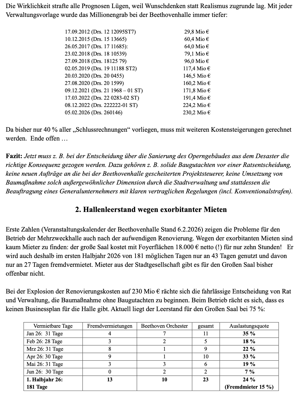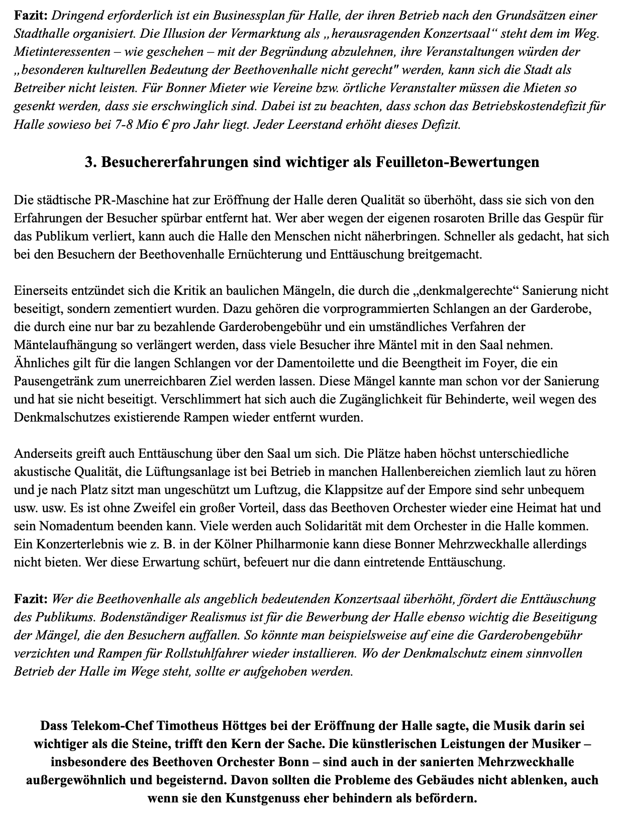 nach zehnjähriger Bauzeit und einer Explosion der Baukosten auf 221 Mio € wieder eröffnet. Erfreulich ist dabei, dass das Beethoven Orchester wieder eine Heimat hat. Aber die grundlegenden Probleme der Halle z. B. wegen exorbitanter Mietkosten bleiben bestehen