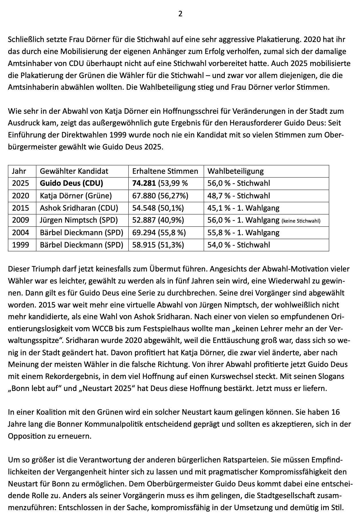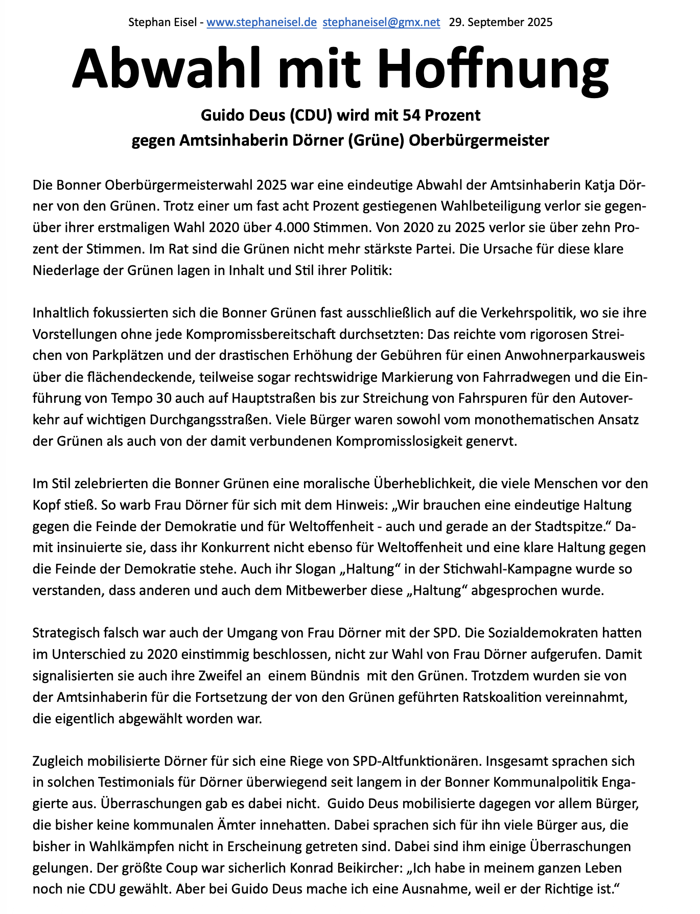 von der CDU zum neuen Bonner Oberbürgermeister war in erheblichem Maß eine Abwahl der bisherigen Amtsinhaberin Katja Dörner von den Grünen. Mit ihrer monothematischen und kompromisslosen Politik gepaart mit der Anmutung moralischer Überlegenheit verlor sie in fünf Jahren zehn Prozent der Stimmen und Guide Deus siegte mit dem Rekordergebnis von 54 Prozent.