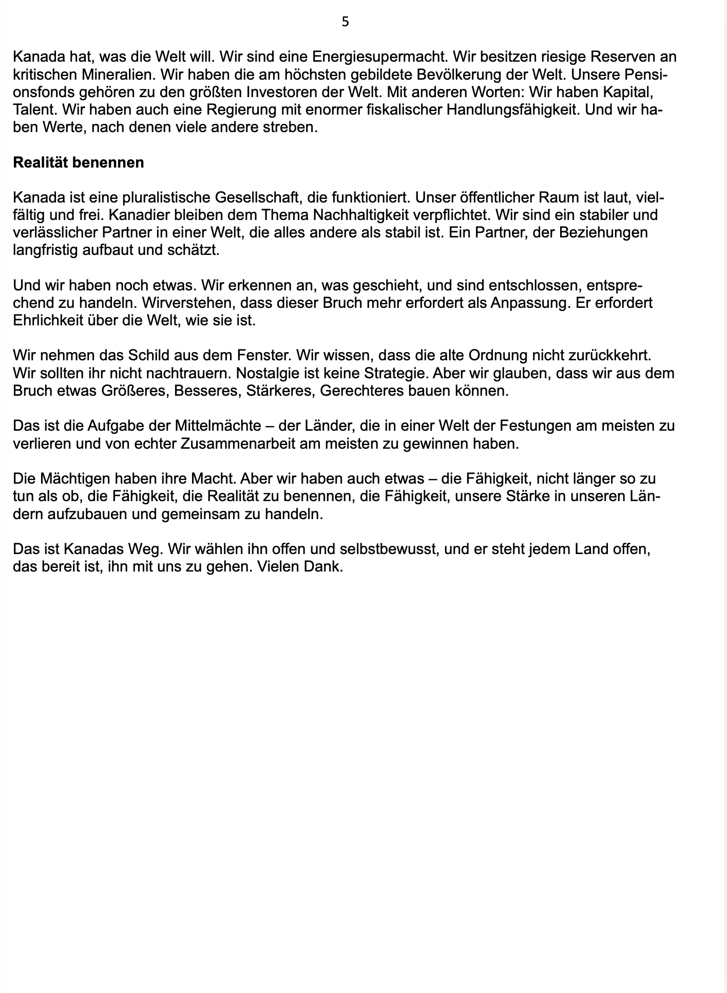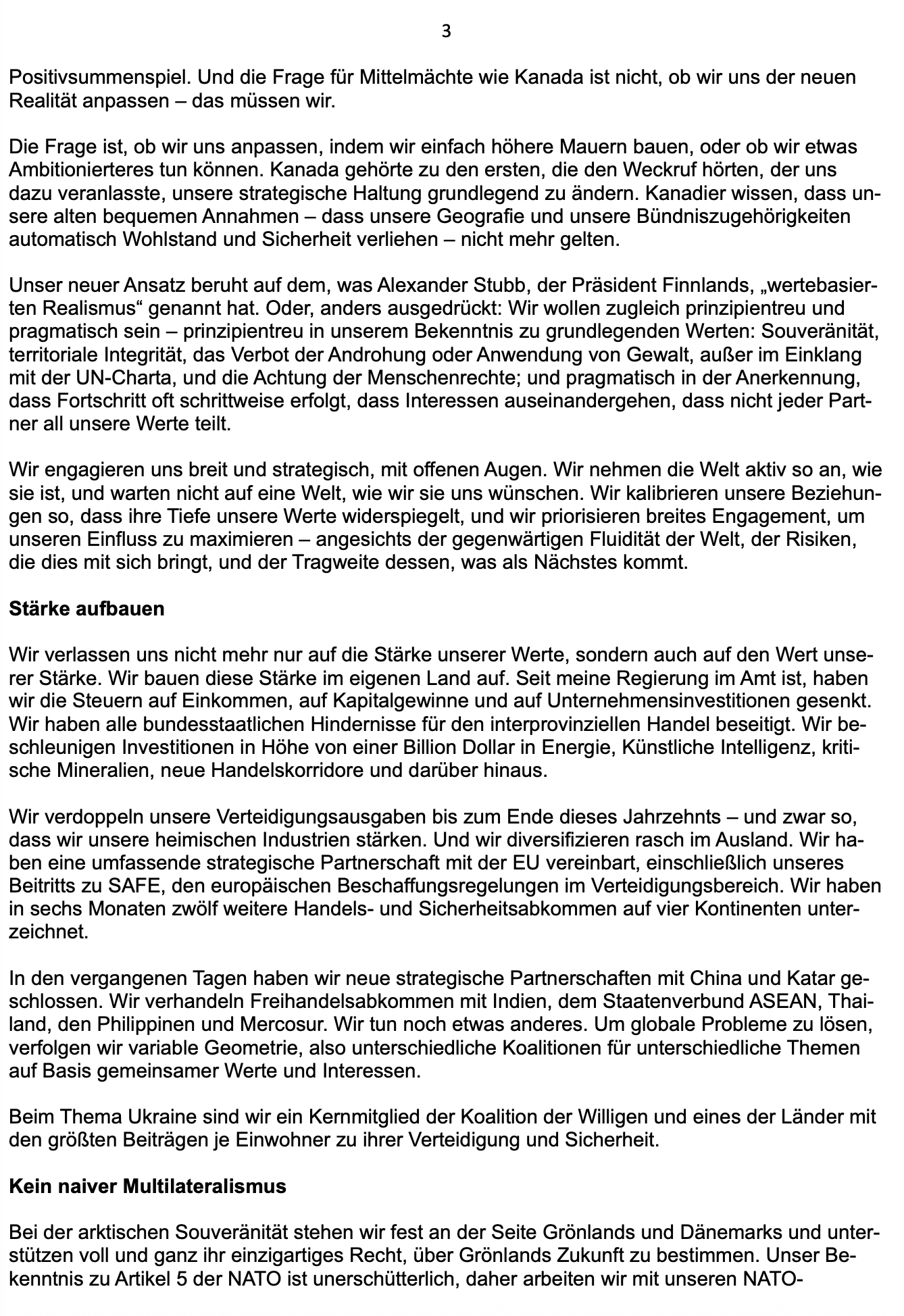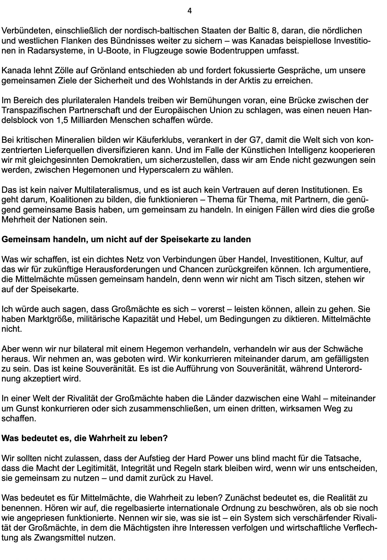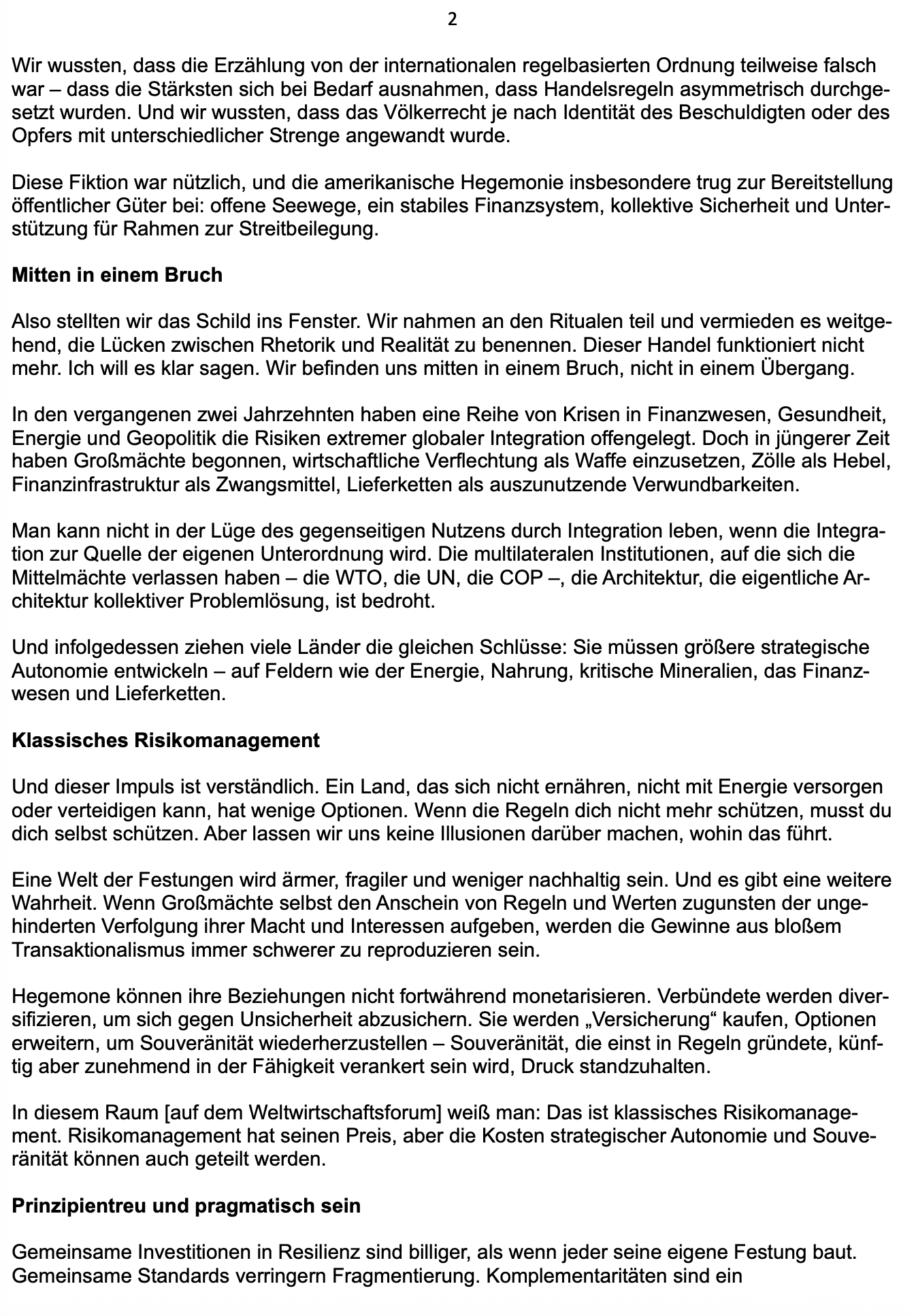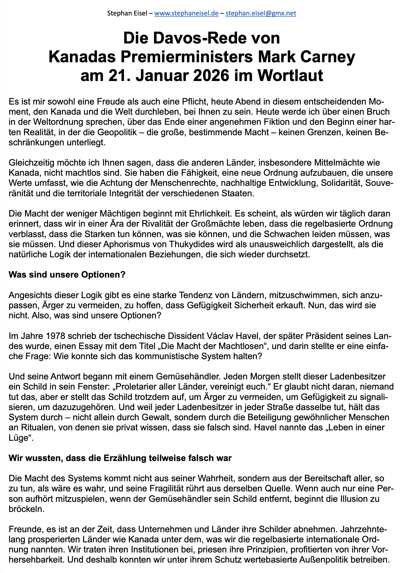 hat der kanadische Premierminister Mark Carney am 21. Januar 2026 beim Weltwirtschaftsforum in Davos aufgezeigt, den demokratische Mittelmächte angesichts der immer unverholeneren hegemonialen Politik der Großmächte einschlagen sollten.