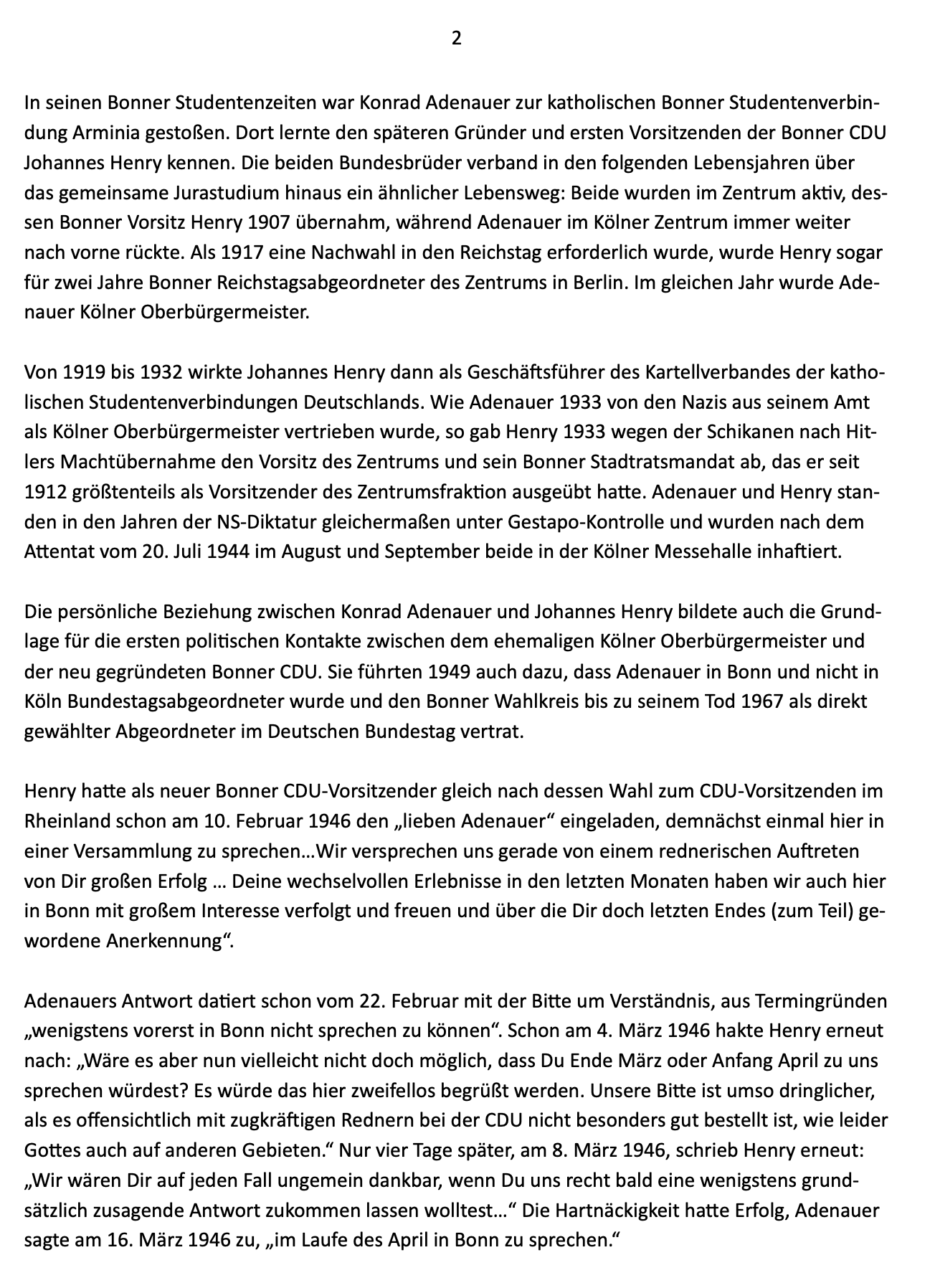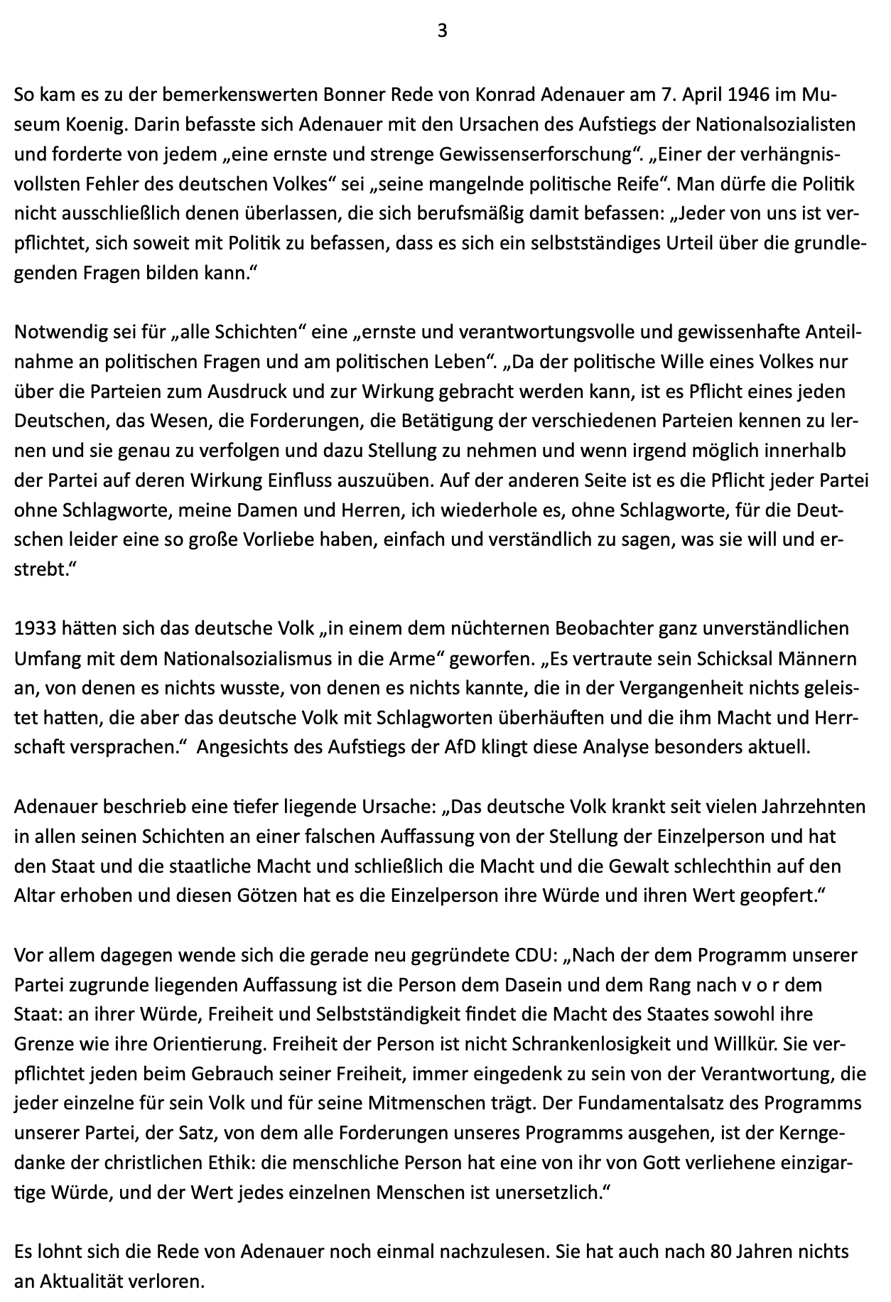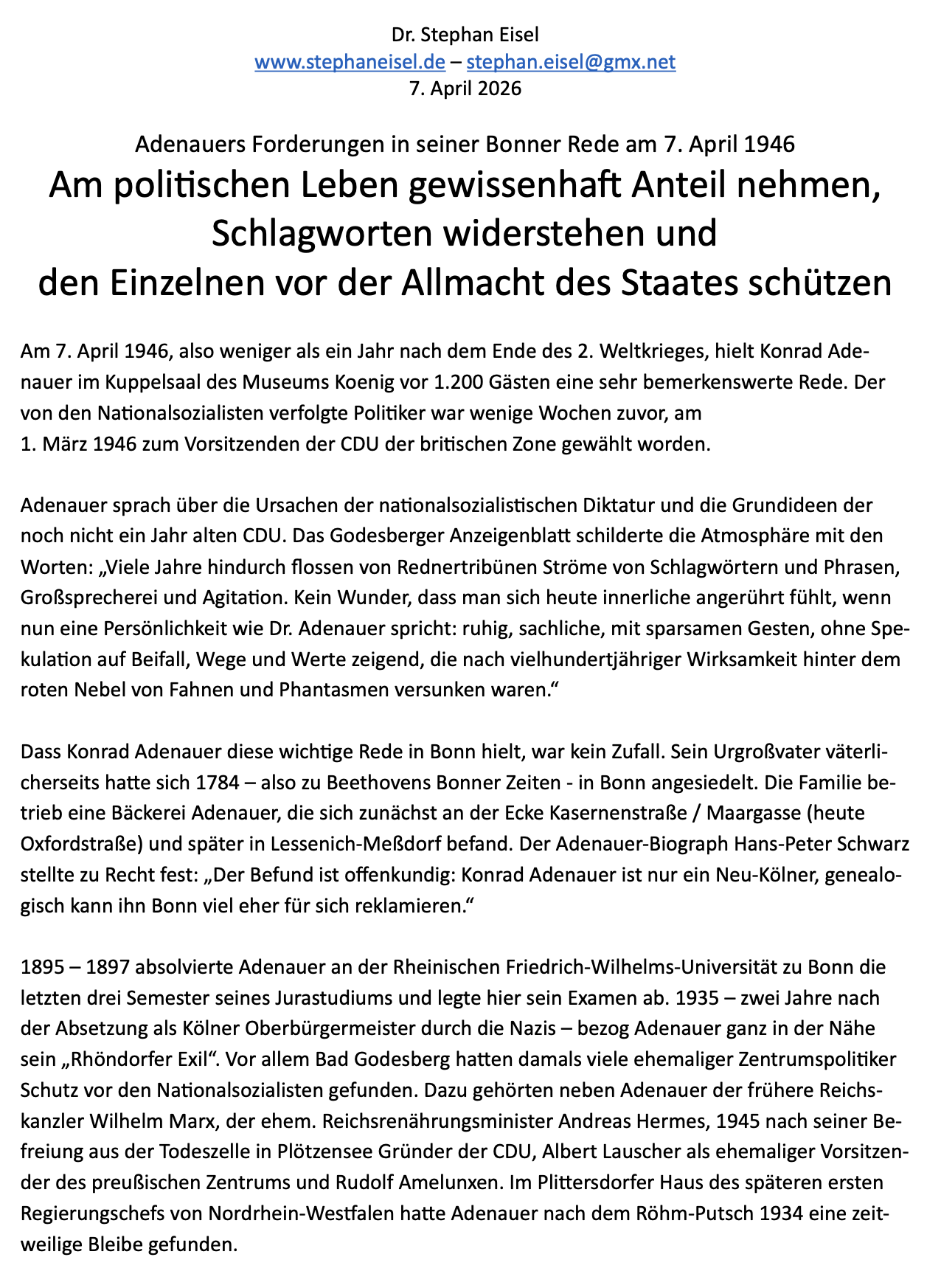 am 7. April 1946 eine sehr bemerkenswerte Rede im Bonner Museum Koenig, wo er drei Jahre später als Vorsitzender des Parlamentarischen Rates die Ausarbeitung des Grundgesetzes leitete. Seine damaligen Mahungen blieben hochaktuell: Am politischen Leben gewissenhaft Anteil nehmen, Schlagworten widerstehen und den Einzelnen vor der Allmacht des Staates schützen.