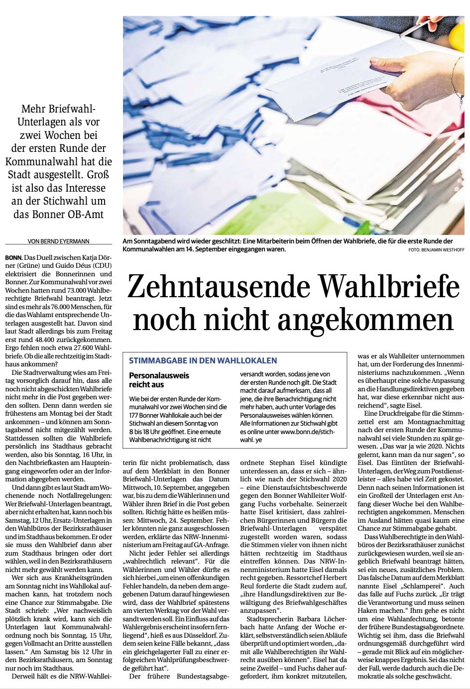 Bei der Bonner OB-Stichwahl am 27. September 2020 war es zu erheblichen Verzögerungen bei der Versendung von Briefwahlunterlagen gekommen, so dass viele Wähler von ihrem Wahlrecht keinen Gebrauch machen konnten. Der ehemalige Bonner Bundestagsabgeordnete Stephan Eisel hatte darüber sich bereits zwei Tage vor der Stichwahl am 25. September 2020 schriftlich bei Stadtdirektor Wolfgang Fuchs in dessen Funktion als Wahlleiter beschwert, und „schwerwiegende Versäumnisse der Wahlleitung“ kritisiert.