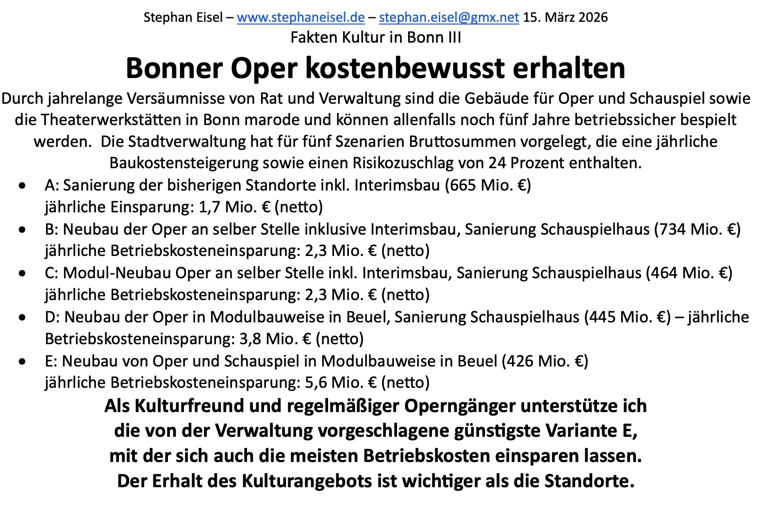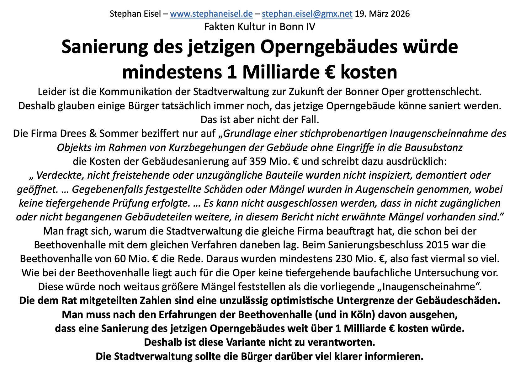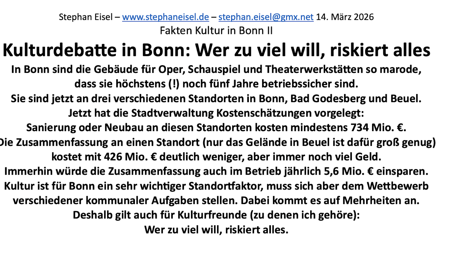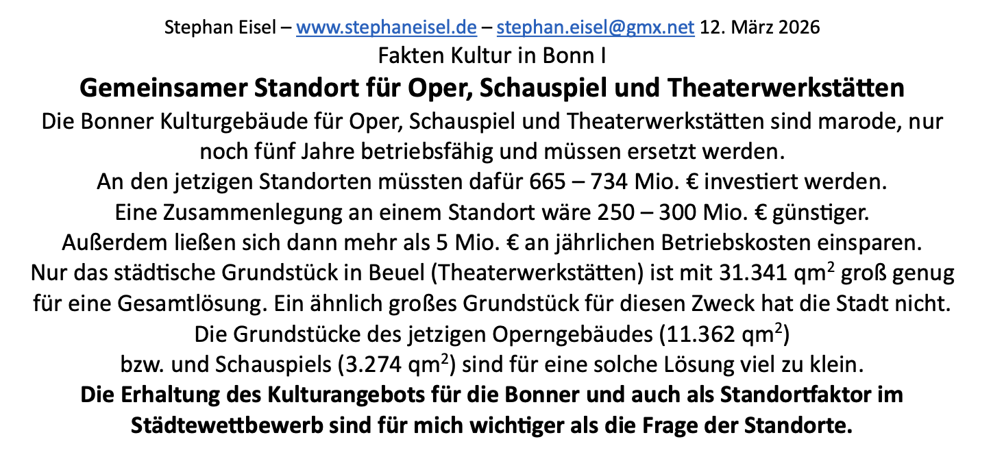 in Bonn die Diskussion um die Zukunft der Oper. Damit gefährden sie das Kulturangebot, dessen langfristiger Sicherung sich Debatten um Standorte und Gebäude unterordnen sollten. Stephan Eisel hat dazu Fakten zusammengetragen, die ständig aktualisiert werden.