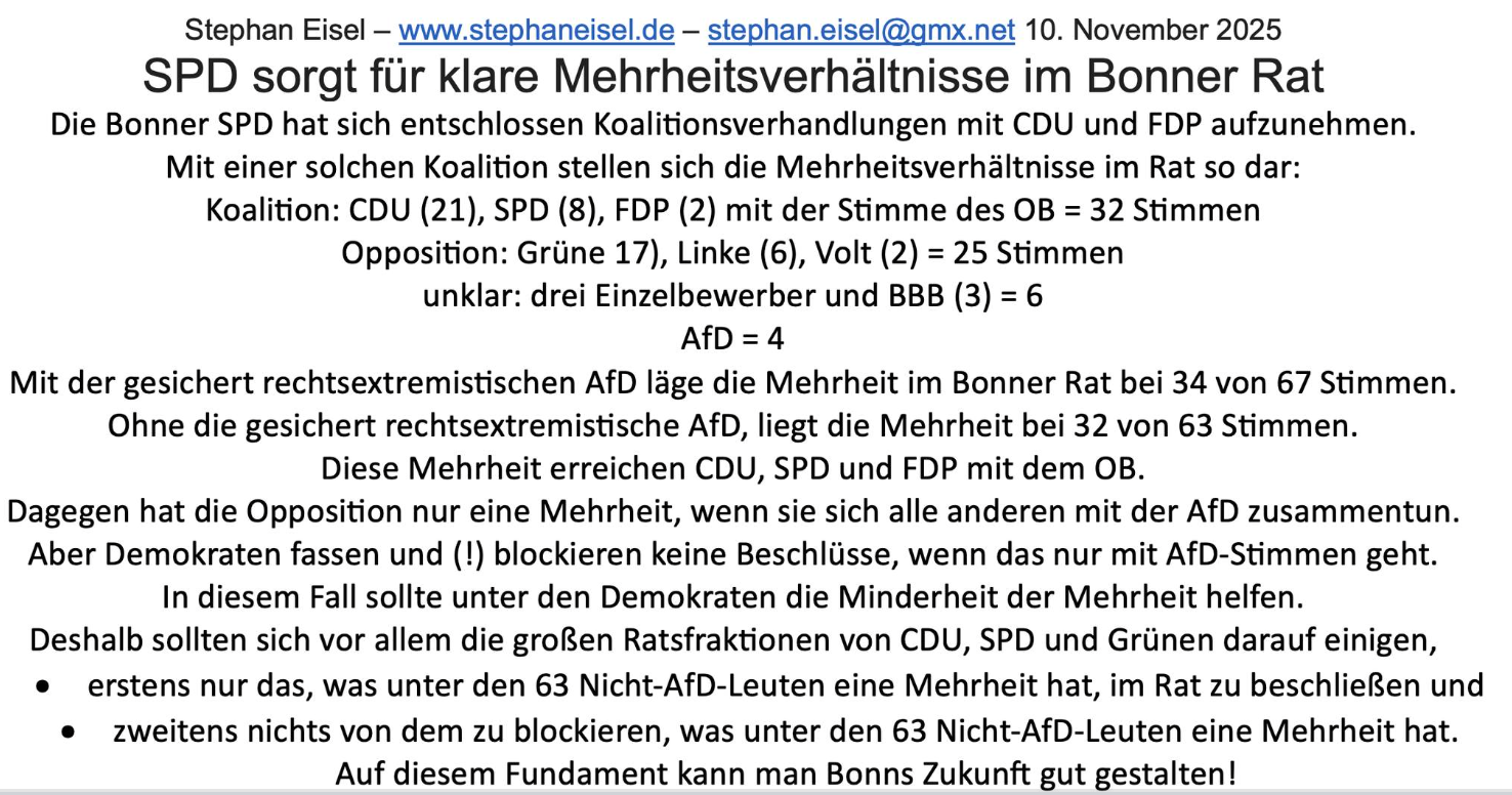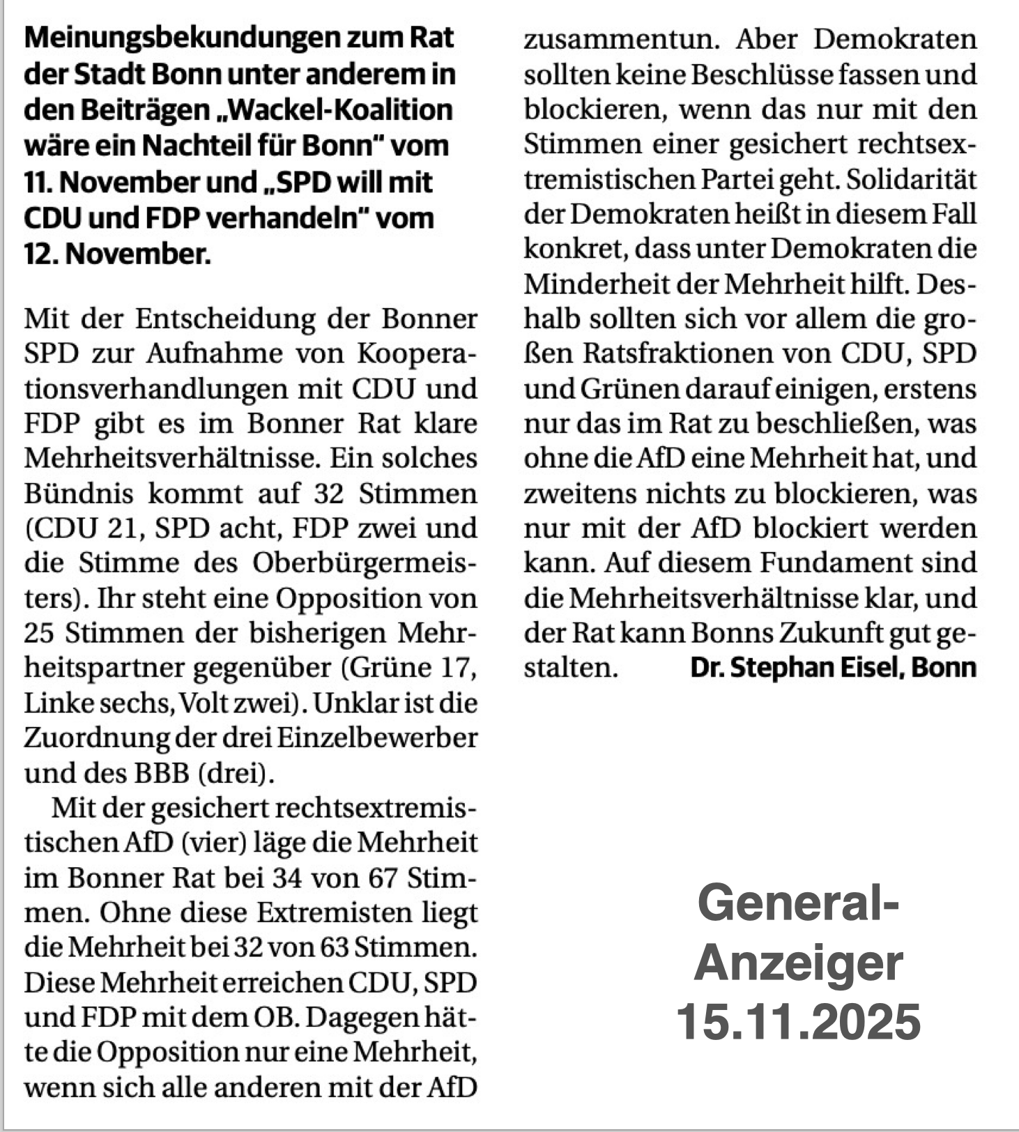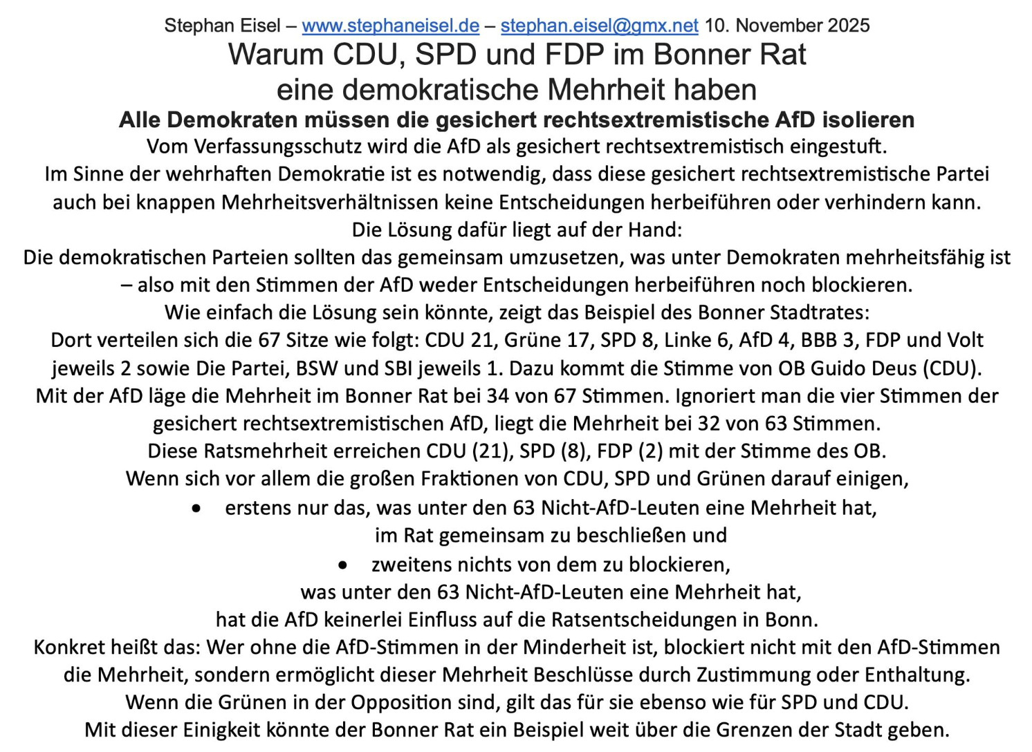 im Bonner Stadtrat nicht zum Zünglein an der Waage wird, müssen sich die demokratischen Parteien einigen: Demokraten fassen und (!) blockieren keine Beschlüsse, wenn das nur mit AfD-Stimmen geht. In diesem Fall hilft unter den Demokraten die Minderheit der Mehrheit. Die von CDU, SPD und FDP angestrebte Kooperation schafft dafür die Voraussetzung.