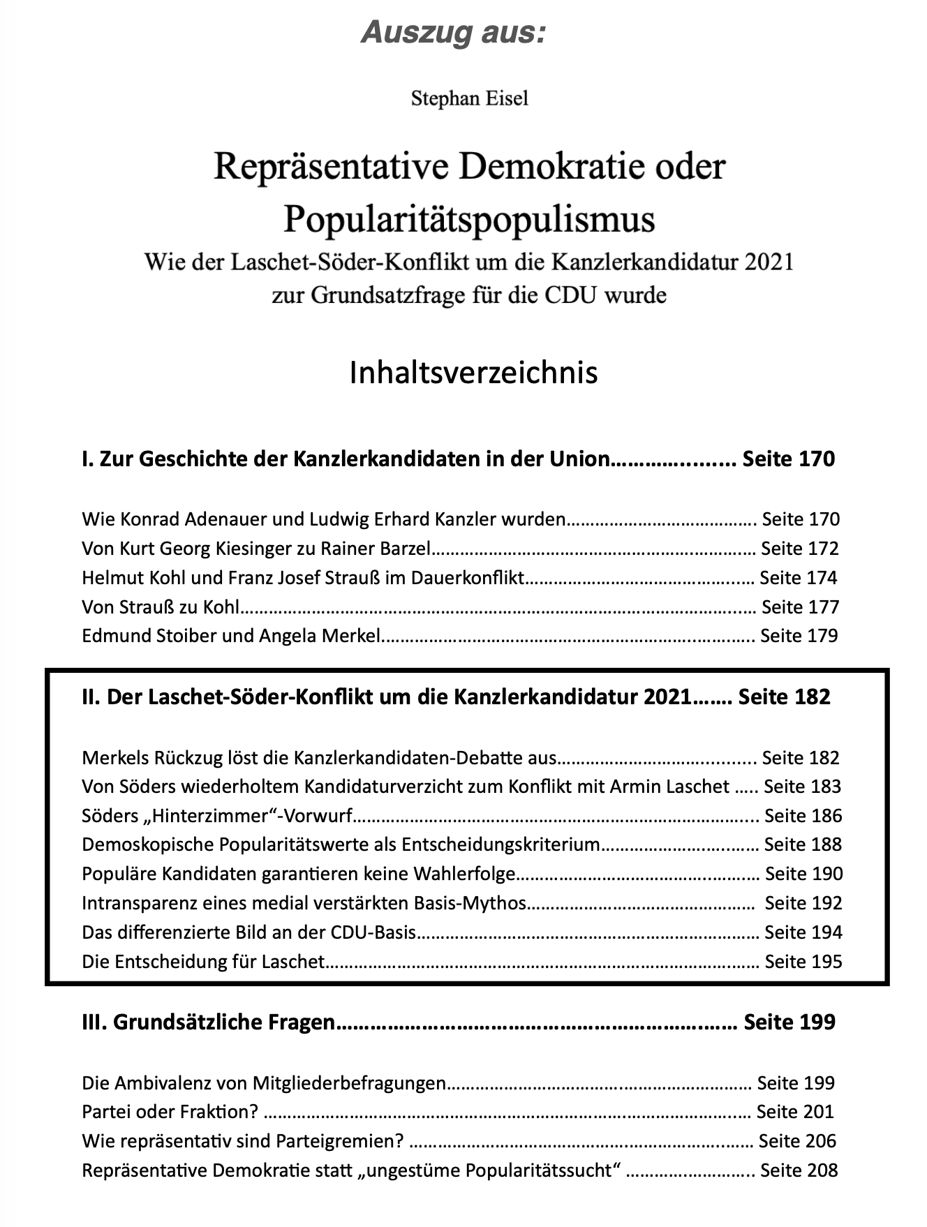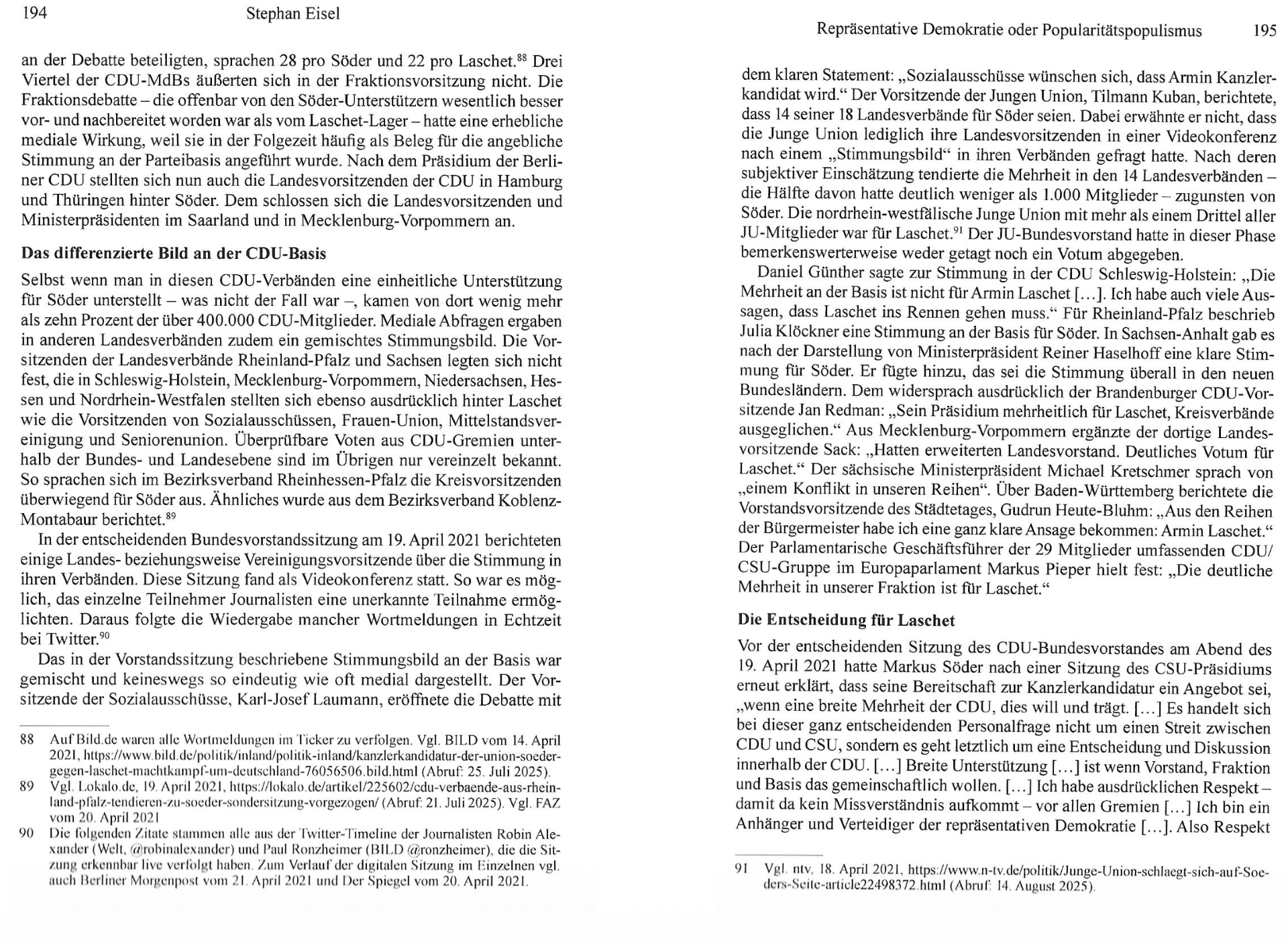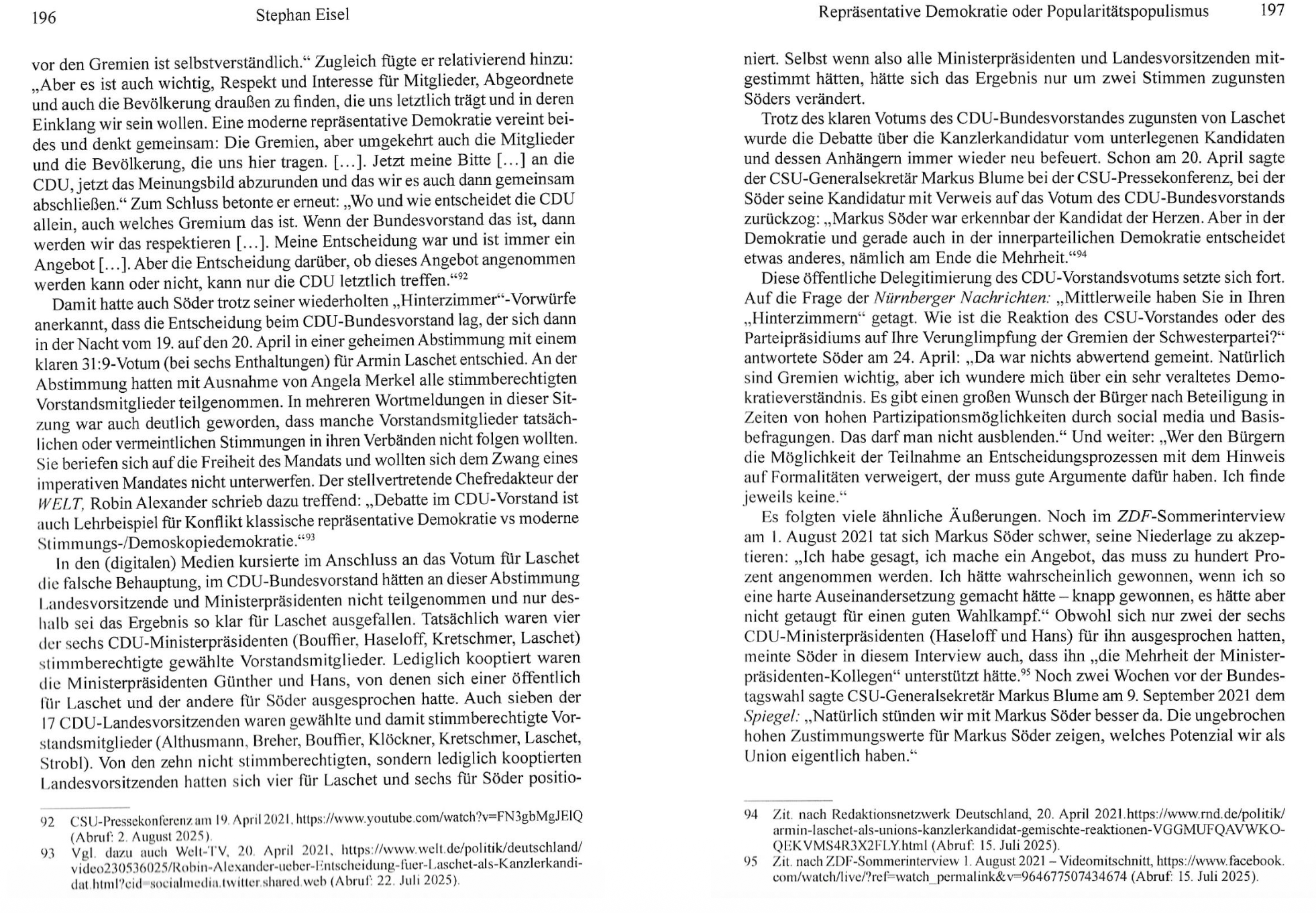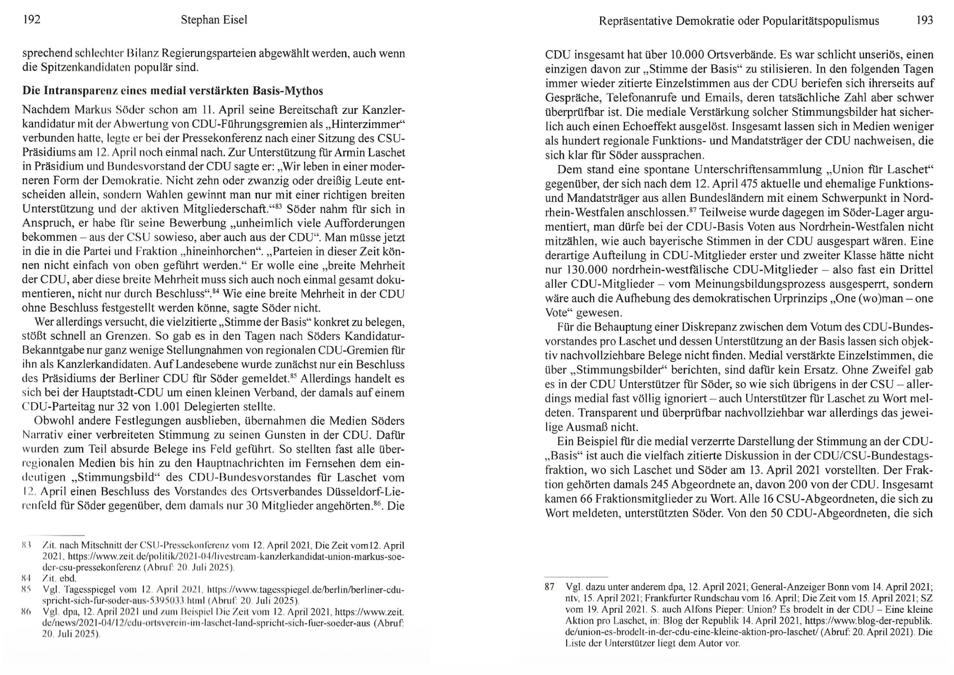 Stephan Eisel zeichnet in seiner Analyse nach, wie der Rückzug von Angela Merkel die Kanzlerkandidaten-Debatte auslöste und es nach Söders wiederholtem Kandidaturverzicht doch zum Konflikt mit Armin Laschet kam. Dabei erhob Söder gegen geordnete Verfahren in gewählten Gremien einen „Hinterzimmer“-Vorwurf, um demoskopische Popularitätswerte als Entscheidungskriterium durchzusetzen und sich auf einen medial verstärkten Basis-Mythos zu stützen.