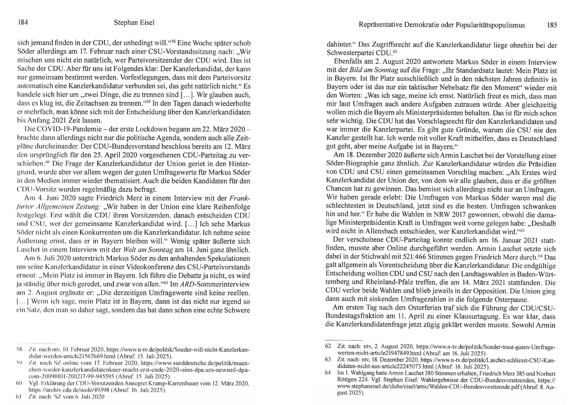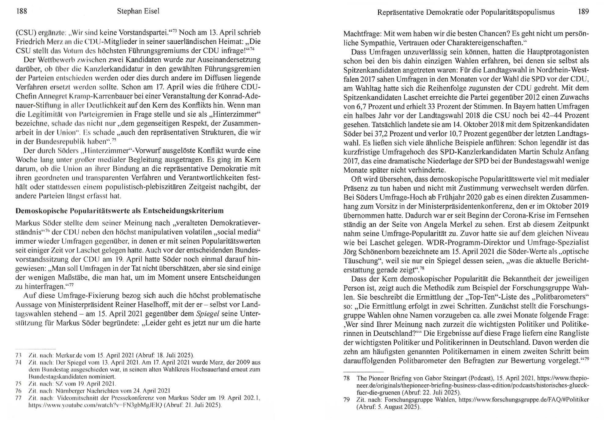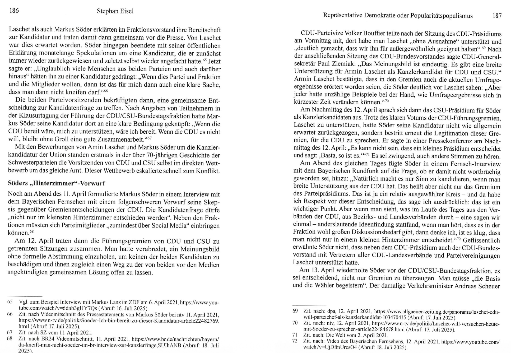 Stephan Eisel zeichnet in seiner Analyse nach, wie der Rückzug von Angela Merkel die Kanzlerkandidaten-Debatte auslöste und es nach Söders wiederholtem Kandidaturverzicht doch zum Konflikt mit Armin Laschet kam. Dabei erhob Söder gegen geordnete Verfahren in gewählten Gremien einen „Hinterzimmer“-Vorwurf, um demoskopische Popularitätswerte als Entscheidungskriterium durchzusetzen und sich auf einen medial verstärkten Basis-Mythos zu stützen.