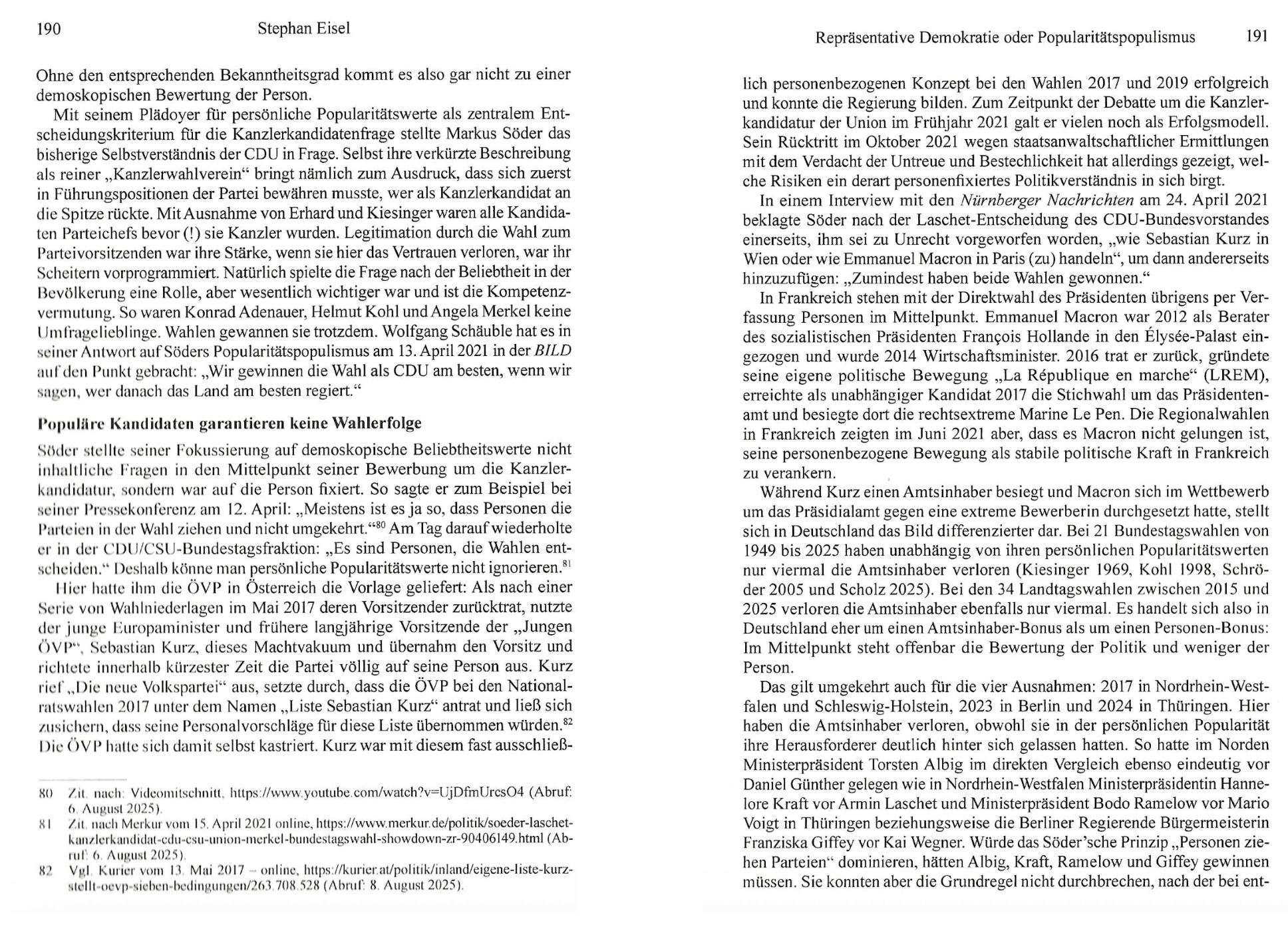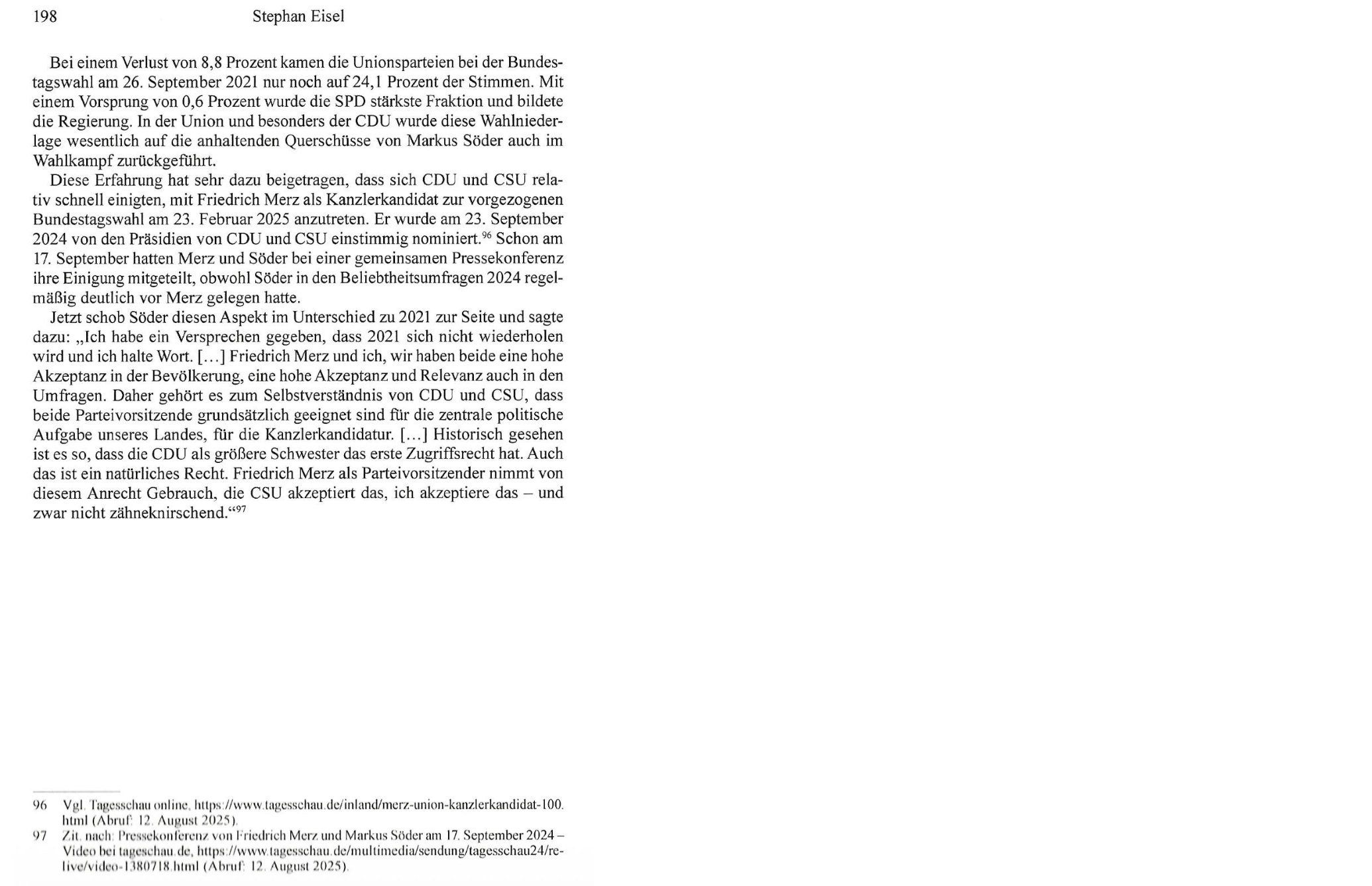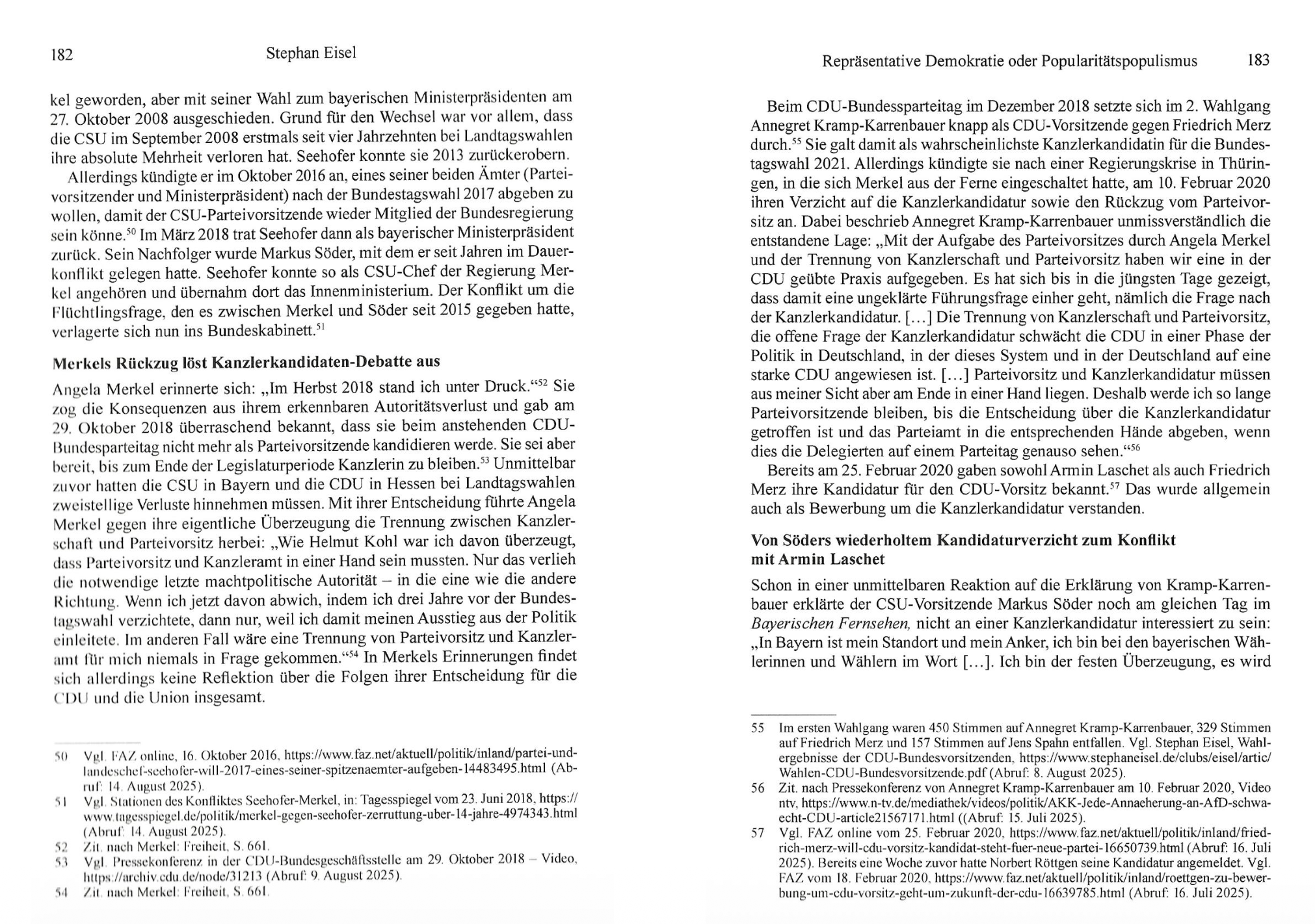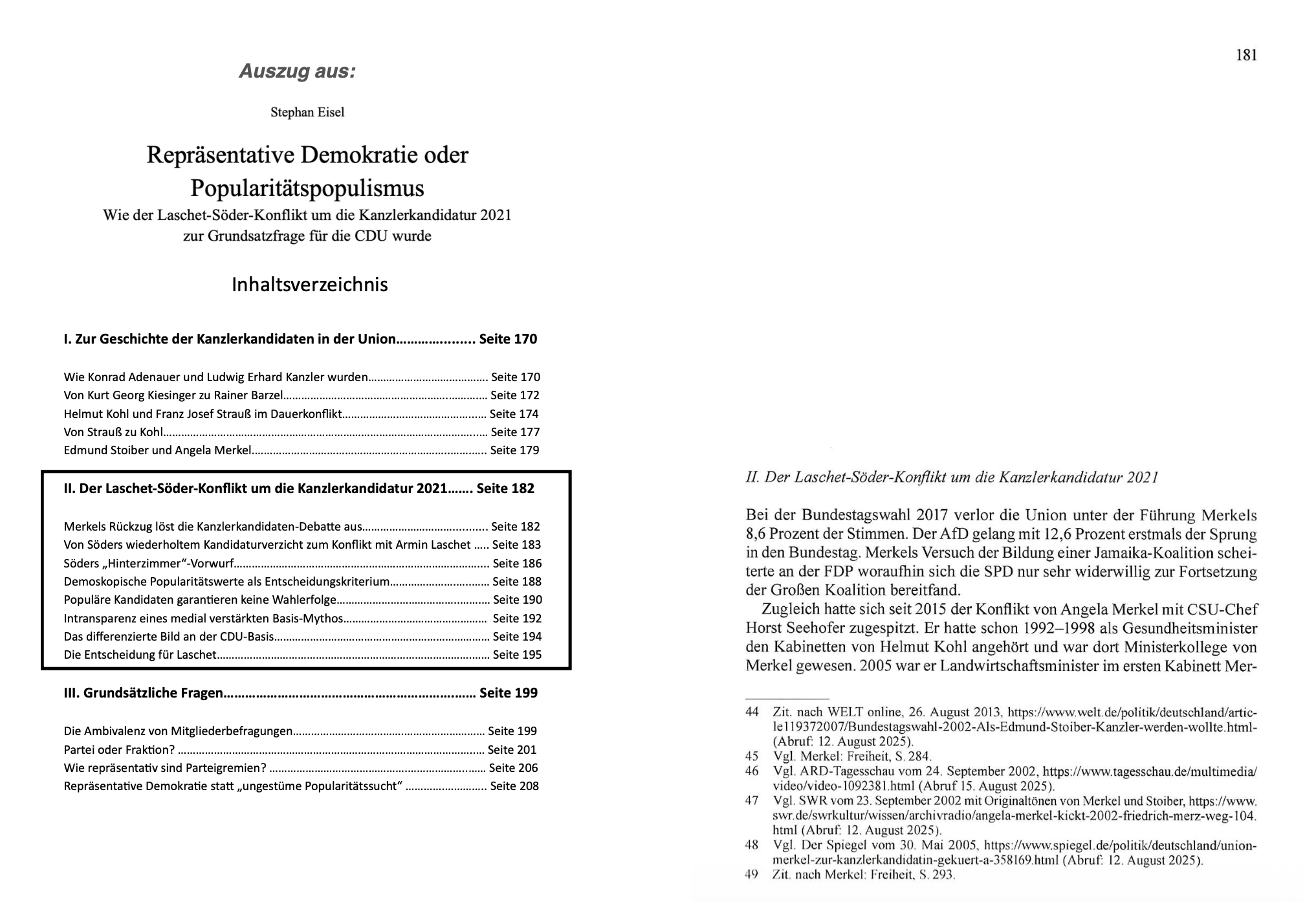 Stephan Eisel zeichnet in seiner Analyse nach, wie der Rückzug von Angela Merkel die Kanzlerkandidaten-Debatte auslöste und es nach Söders wiederholtem Kandidaturverzicht doch zum Konflikt mit Armin Laschet kam. Dabei erhob Söder gegen geordnete Verfahren in gewählten Gremien einen „Hinterzimmer“-Vorwurf, um demoskopische Popularitätswerte als Entscheidungskriterium durchzusetzen und sich auf einen medial verstärkten Basis-Mythos zu stützen.
