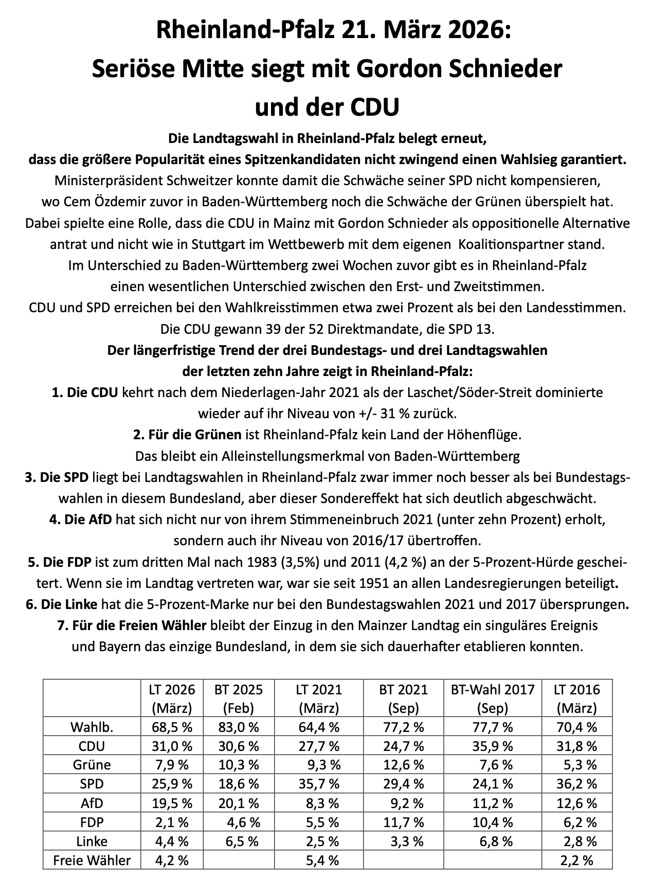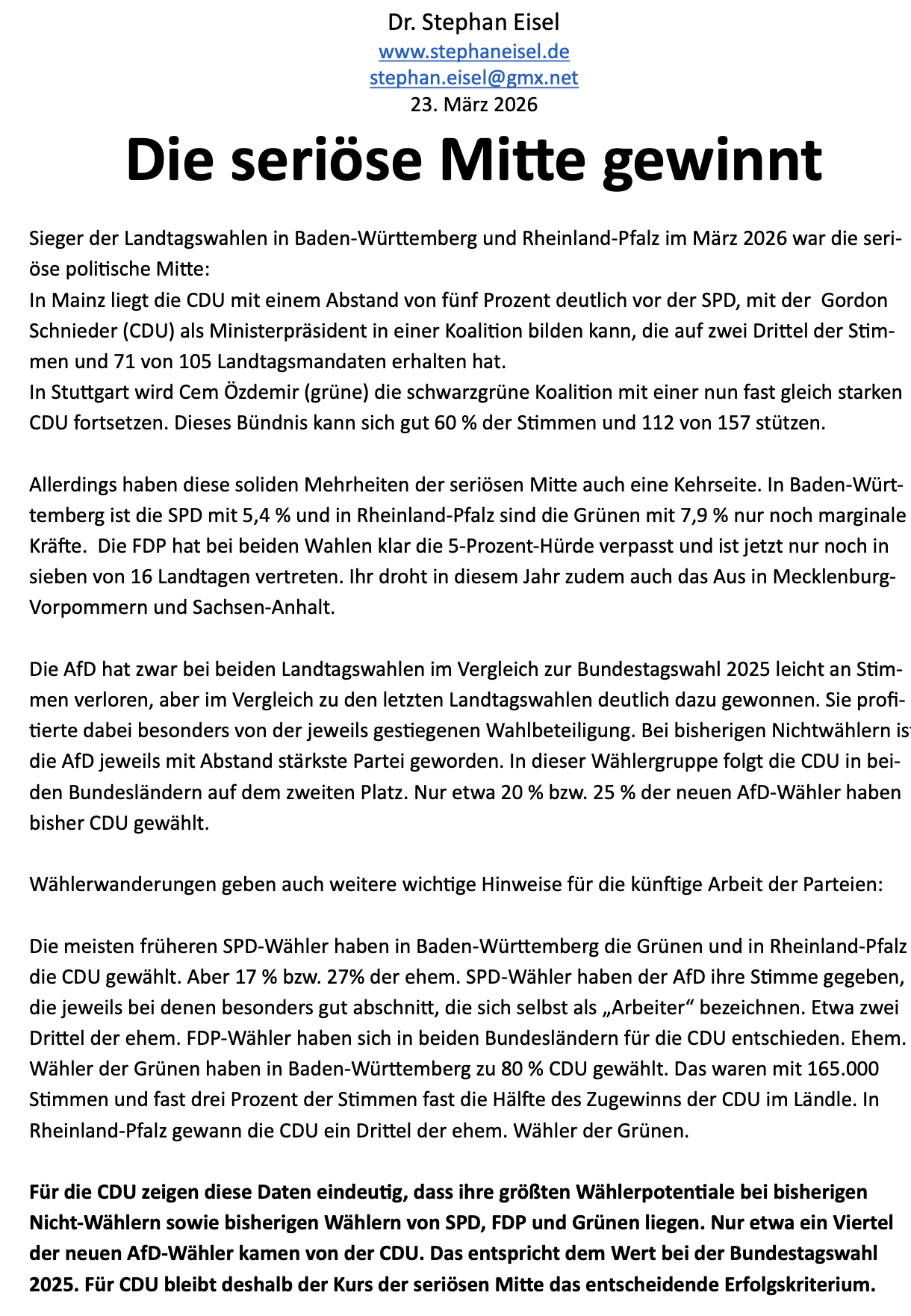 Baden-Württemberg und Rheinland-Pfalz haben gezeigt, dass am erfolgreichsten die Parteien der Mitte sind. Es kommt dort zu stabilen Regierungs-mehrheiten, aber die Ergebnisse haben auch eine Kehrseite: Die FDP verschwindet, die AfD wird zu stark und die SPD hat Probleme. Stephan Eisel analysiert die Ergebnisse.