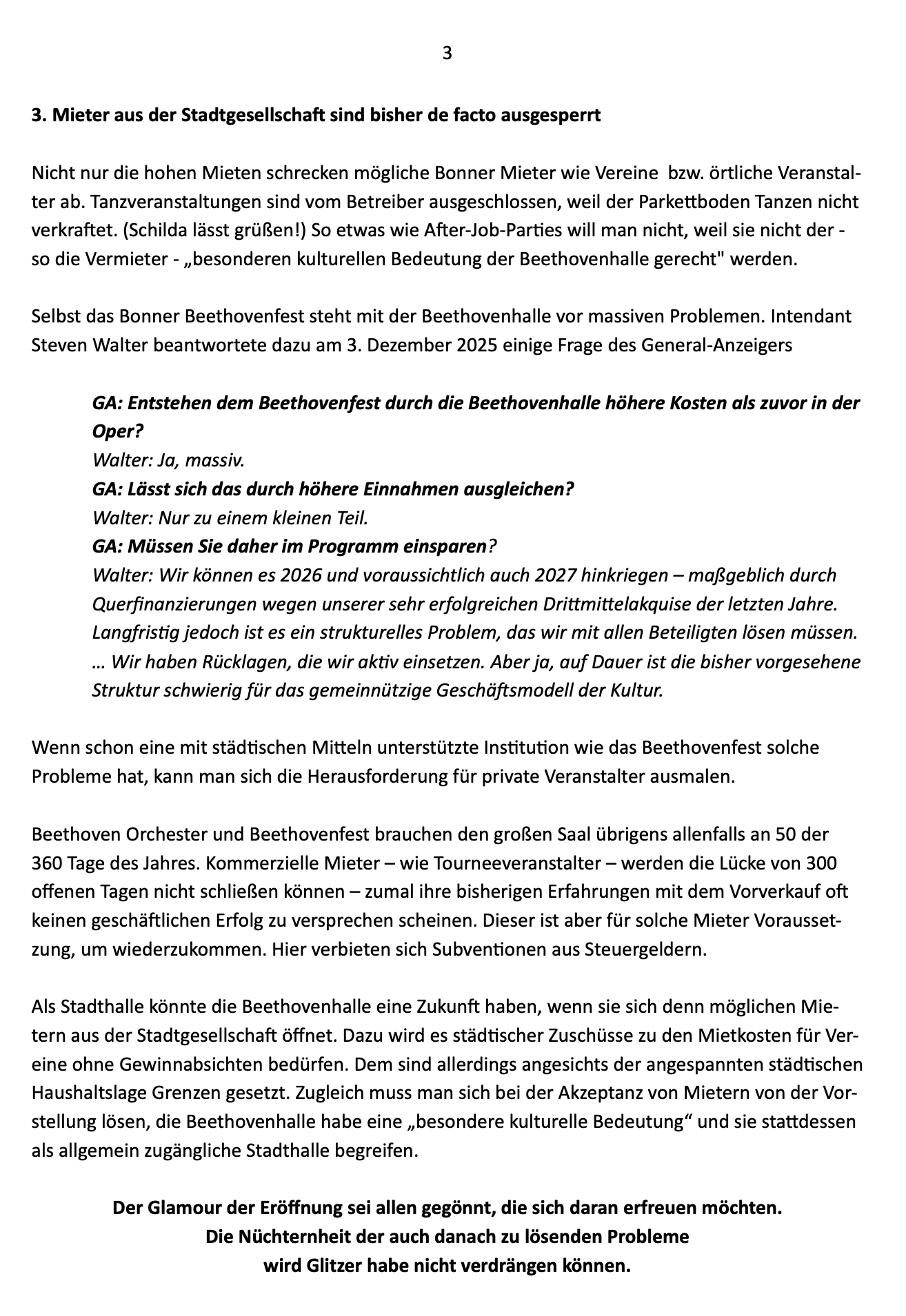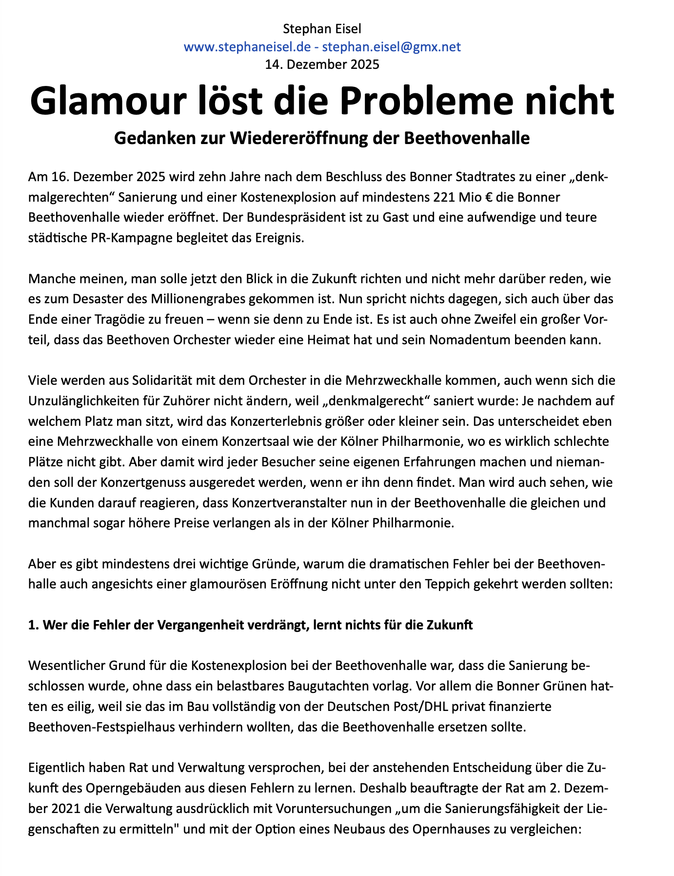 nach zehnjähriger Bauzeit und einer Explosion der Baukosten auf 221 Mio € wieder eröffnet. Erfreulich ist dabei, dass das Beethoven Orchester wieder eine Heimat hat. Aber die grundlegenden Probleme der Halle z. B. wegen exorbitanter Mietkosten bleiben bestehen