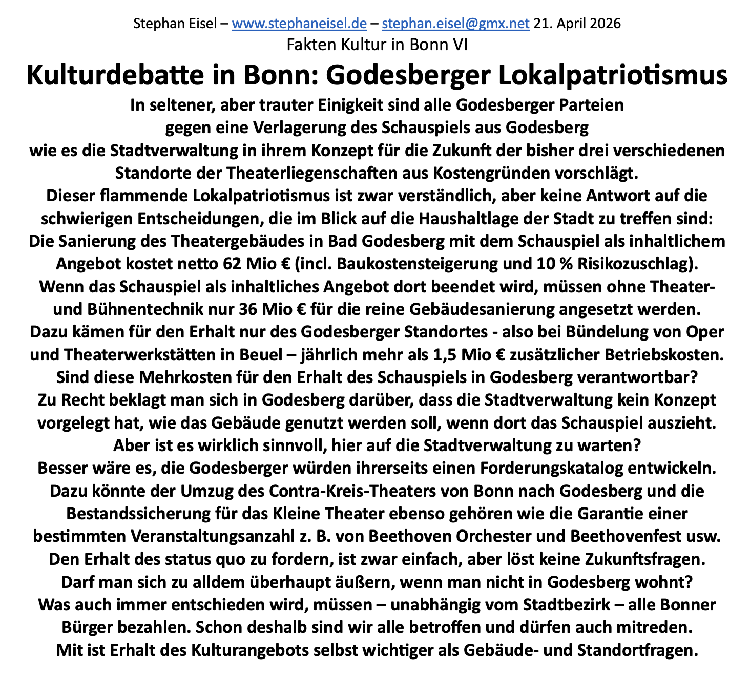 in Bonn die Diskussion um die Zukunft der Oper. Damit gefährden sie das Kulturangebot, dessen langfristiger Sicherung sich Debatten um Standorte und Gebäude unterordnen sollten. Stephan Eisel hat dazu Fakten zusammengetragen, die ständig aktualisiert werden.