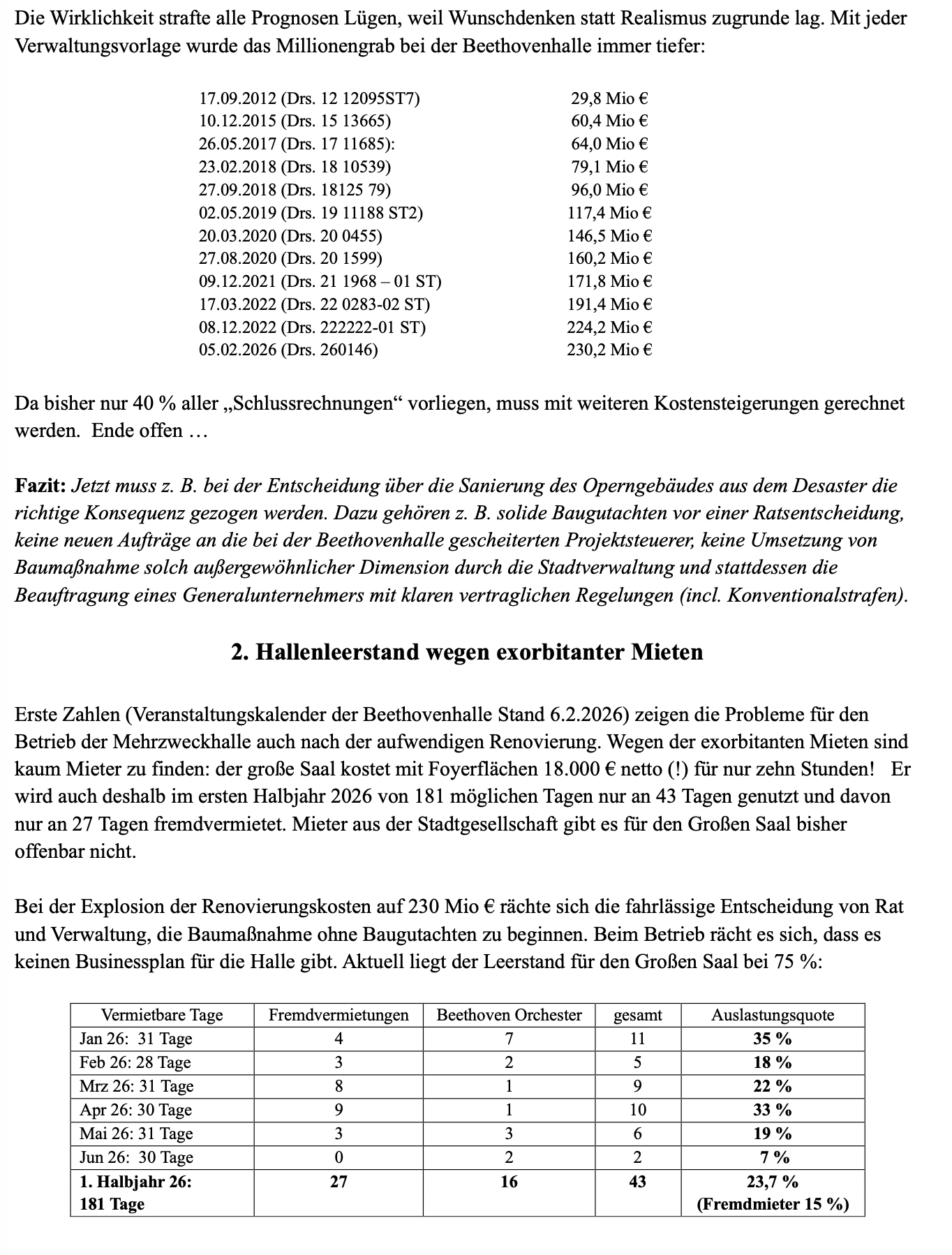 Ende 2025 hat die Probleme der denkmalgerecht sanierten Mehrzweckhalle nicht gelöst. Manche meinen, man solle darüber nicht mehr reden. Wer die Probleme aber unter den Teppich kehrt, trägt weder zu ihrer Lösung bei, noch hilft das, eine Wiederholung der gemachten Fehler bei anstehenden Entscheidungen zu vermeiden.